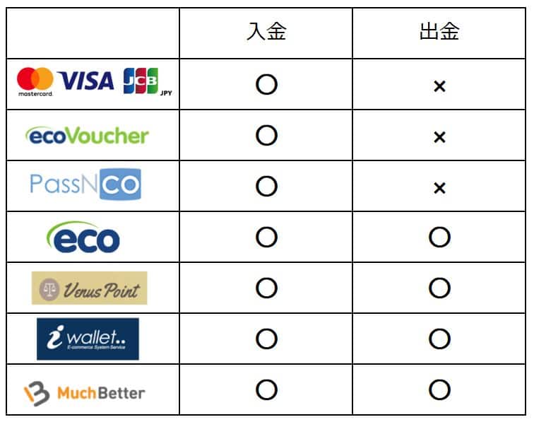 ラッキーニッキー(LuckyNiki)では出金する時の方法として以下の決済をご利用する事が出来ます。