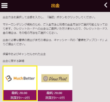 クレジットカードで入金した場合は、クレジットカードへの出金は出来ないので他の決済方法を選択する事が出来ます。(エコペイズ、アイウォレットからの入金履歴がない場合、ヴィーナスポイントからのみの出金となります)